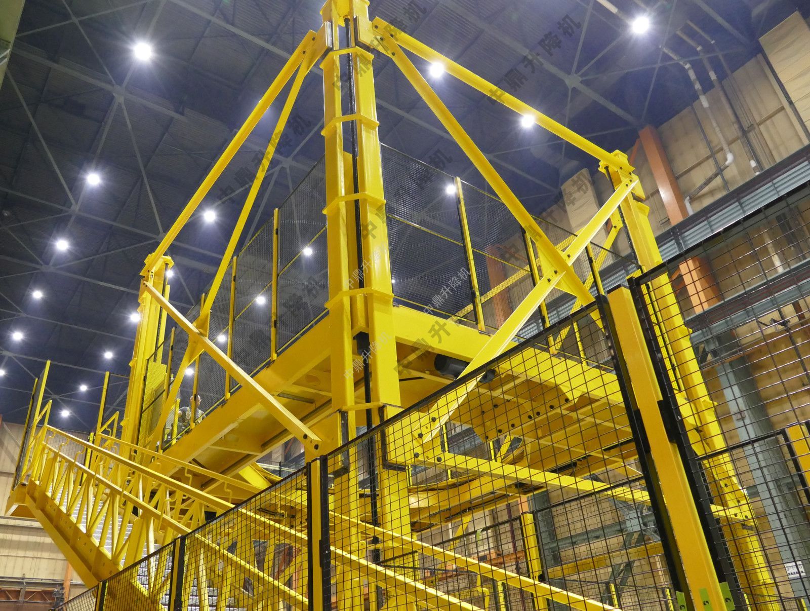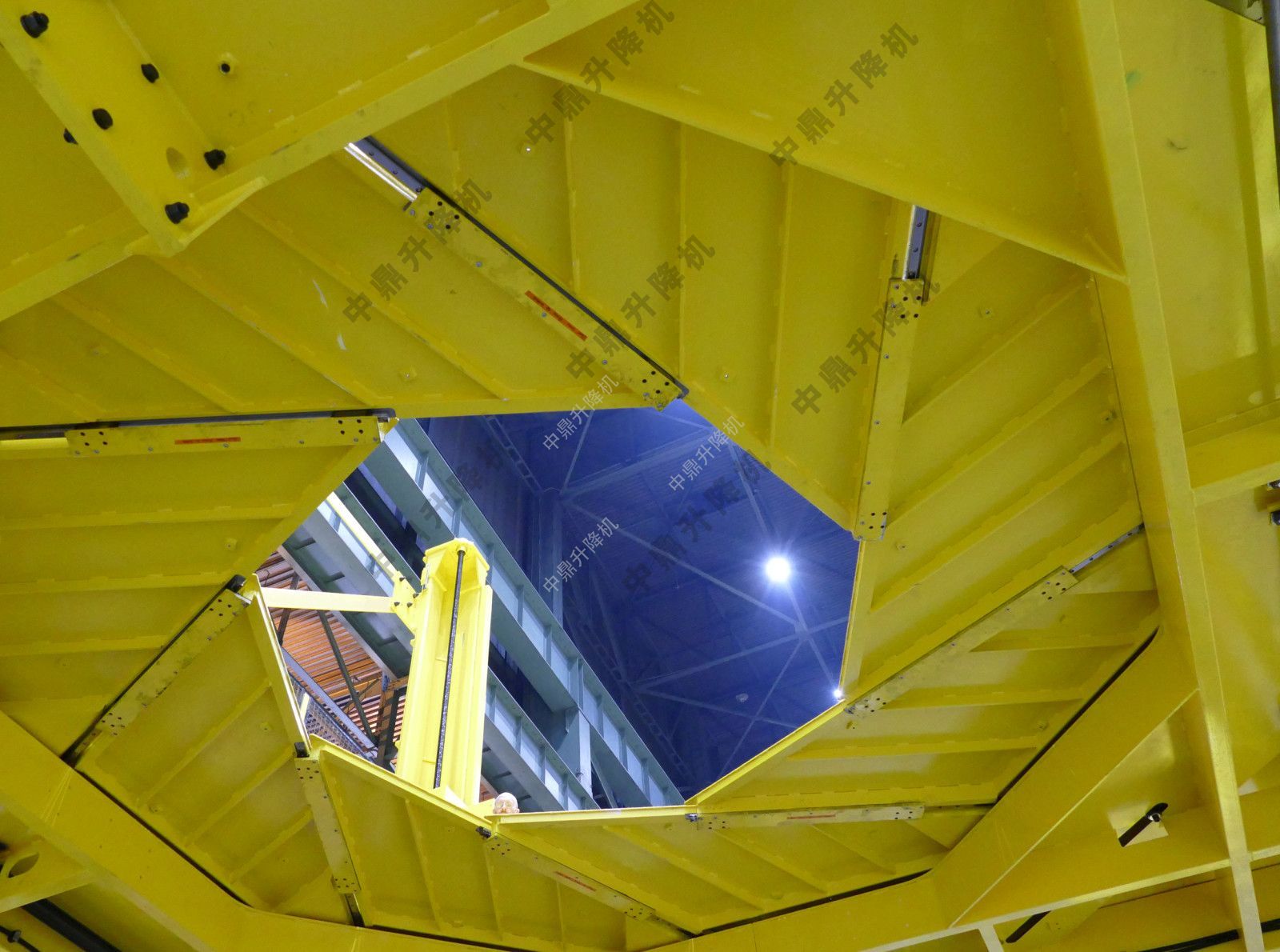 平臺(tái)和樓梯組件的升降是通過放置在每個(gè)角柱上的四個(gè)滾珠絲杠驅(qū)動(dòng)的,每個(gè)滾珠絲杠由強(qiáng)大的電機(jī)驅(qū)動(dòng),每個(gè)滾珠絲螺釘彼此機(jī)械同步。中央光圈開啟驅(qū)動(dòng)是液壓的。