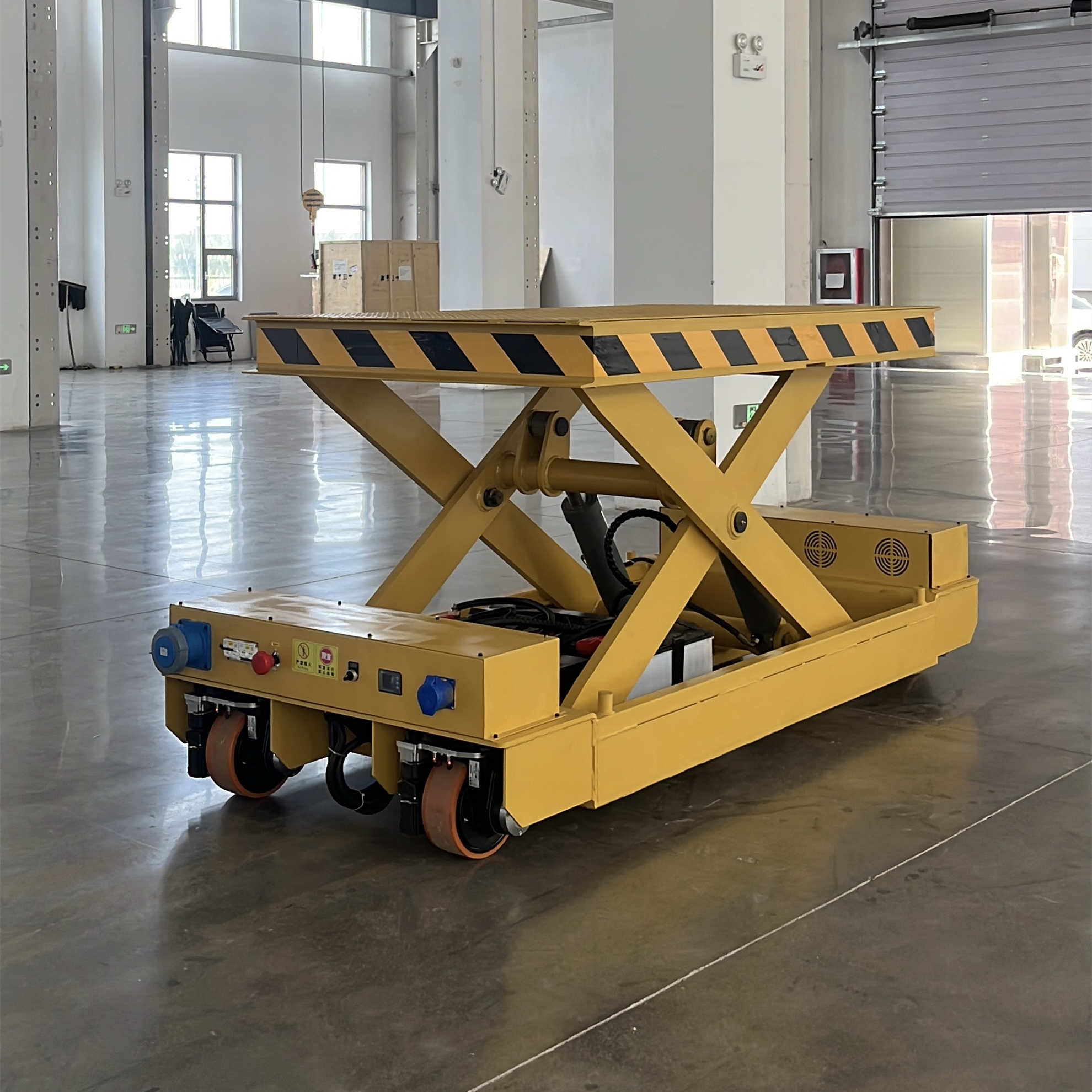 全向激光導(dǎo)航AGV轉(zhuǎn)運(yùn)車,配置有自動(dòng)升降平臺(tái),用于配合其自動(dòng)化立體倉庫系統(tǒng)進(jìn)行大型重物的存儲(chǔ)與搬運(yùn)作業(yè)。該AGV采用激光導(dǎo)航(LGV)技術(shù)